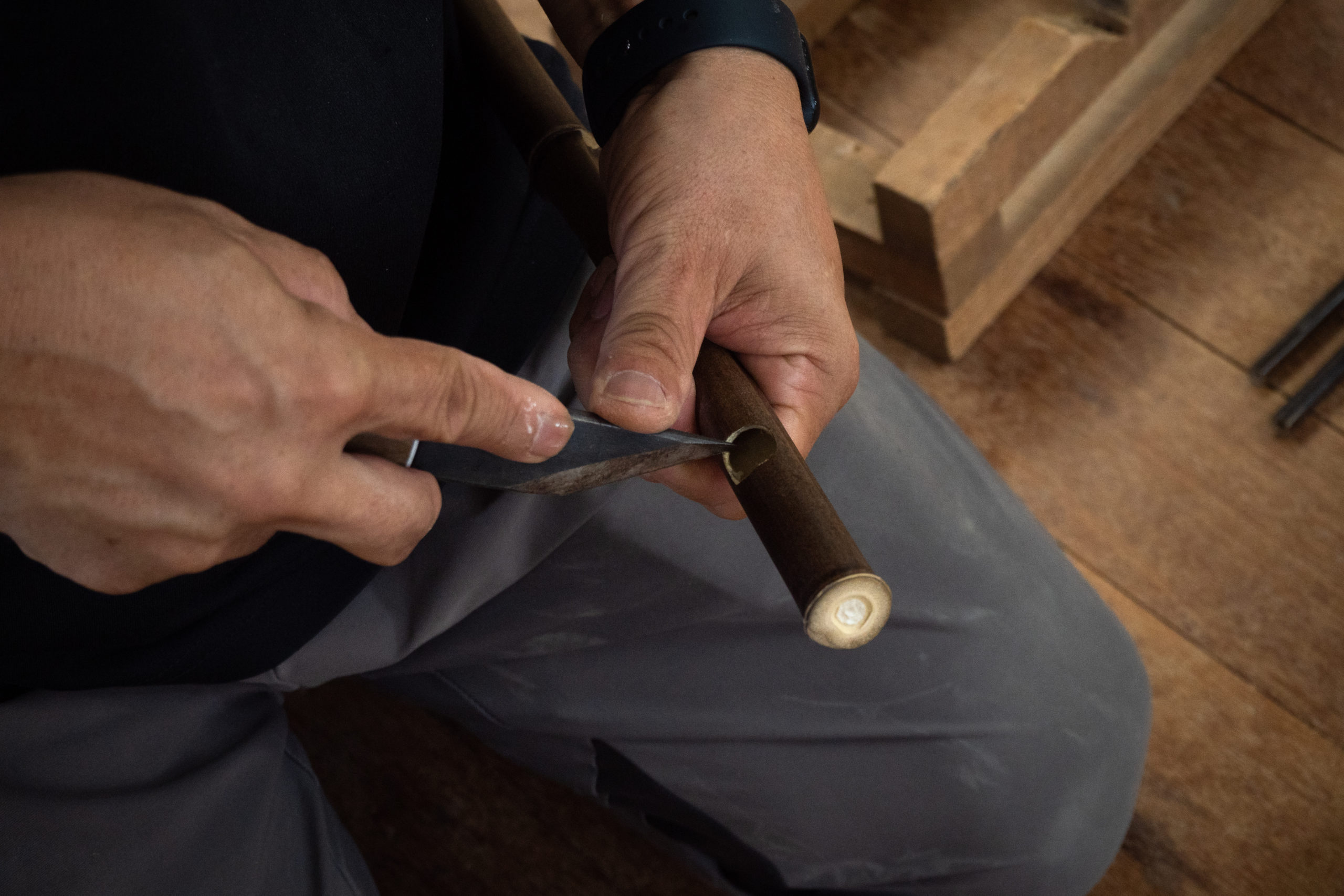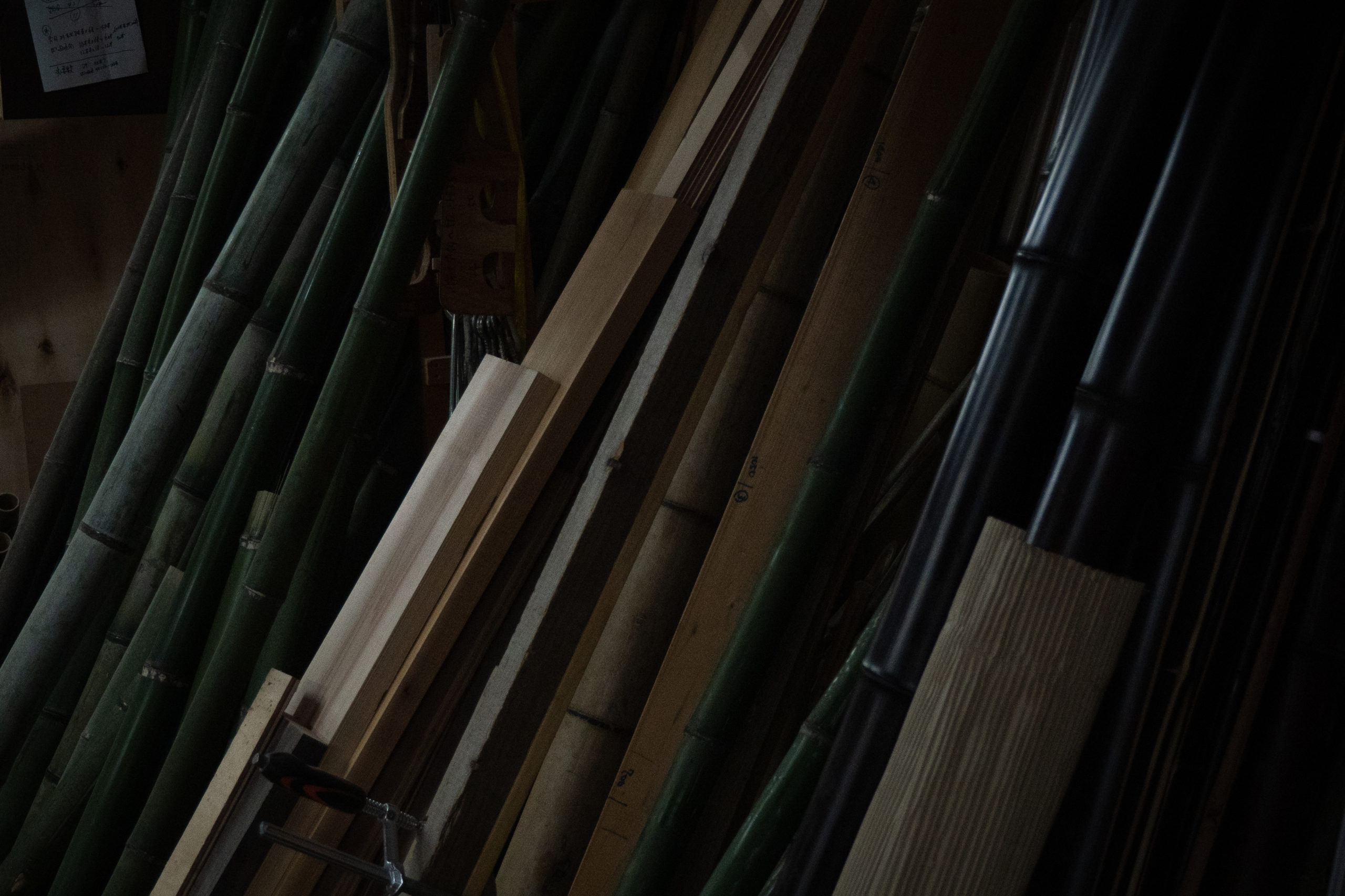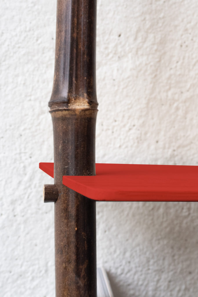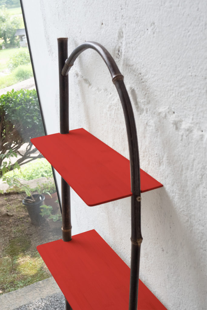 A leaning shelf utilizing bamboo fence techniques. We reinterpreted the n-shaped form of the sode-gaki, a type of bamboo fence, into furniture design to bring the feel of bamboo into daily life. The distinctive curved sections are meticulously hand-bent by carefully heating the bamboo with a burner, creating curves that convey the bamboo’s suppleness and softness at both the top and bottom.