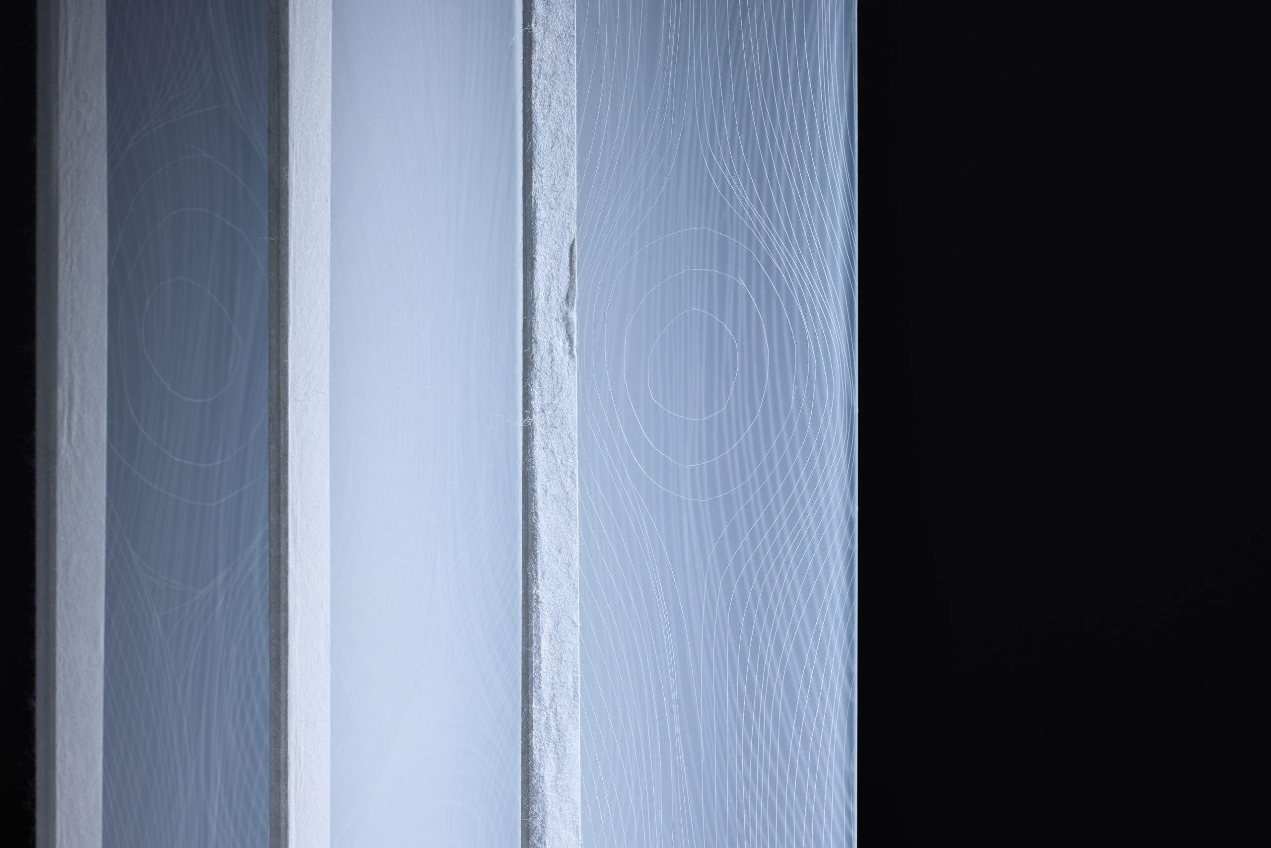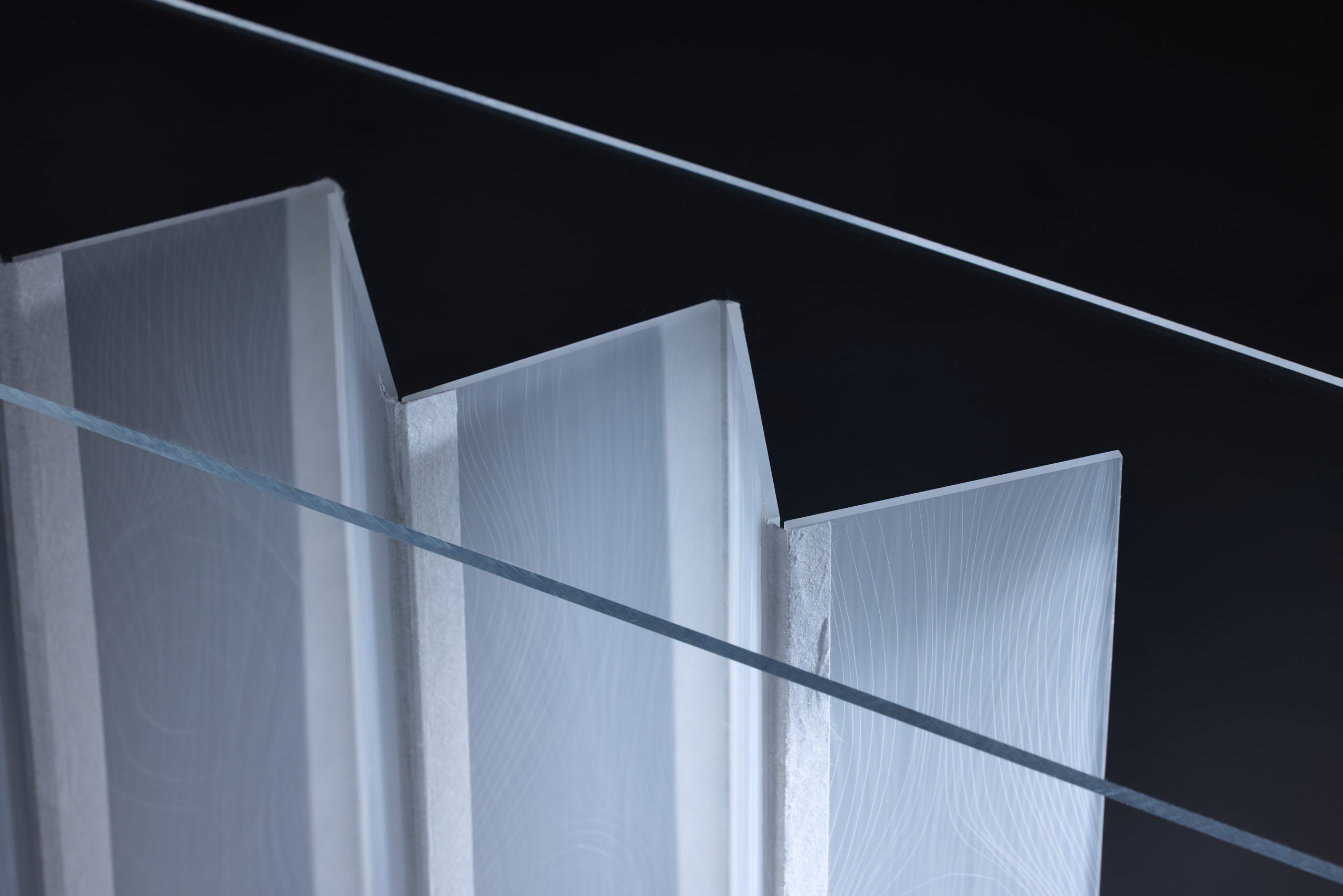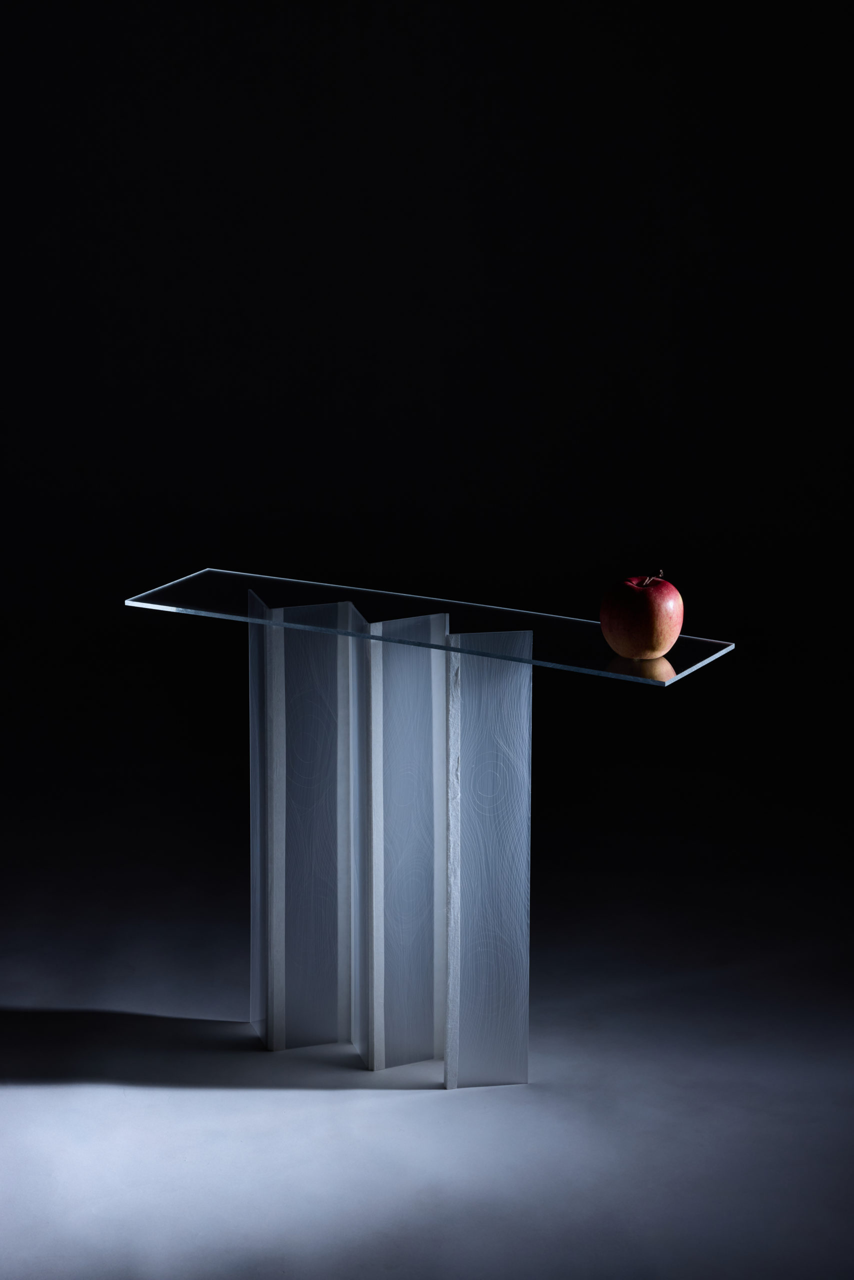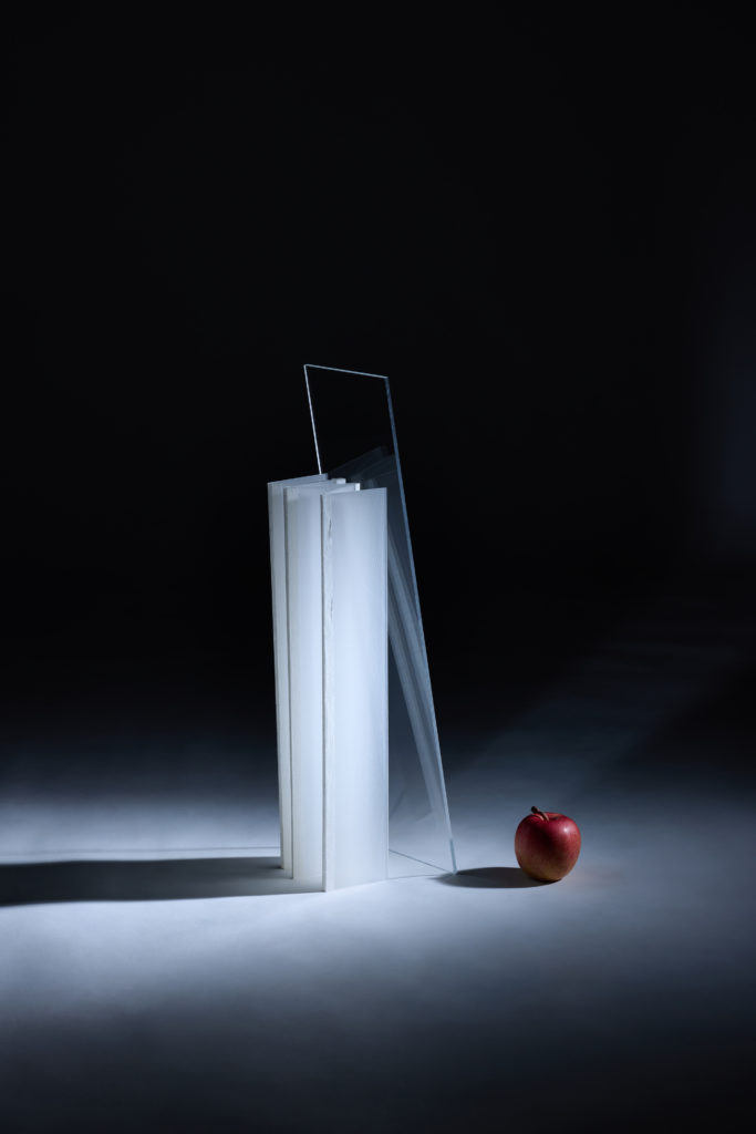 SUKE is a table made from acrylic scraps that unfolds from a folded state and stands on its own. The joints of the milky white acrylic panels of the legs are connected with Japanese paper, which has lines running through them. Acrylic panels blend into our daily lives and are often overlooked. Of the scraps I received this time, I found the long, thin milky white acrylic panel particularly appealing. When held up to light, it has a beautiful, blurred white appearance that is translucent. The appearance changes depending on the position and angle of the light, and I incorporated a folding screen structure so that multiple panels can be enjoyed at the same time. In this way, the transparency of each panel and the shadows they cast on each other further highlight the acrylic panels. Lines resembling the grain of wood have been added to the acrylic panels to create a pattern of lines of light. These can also be seen or hidden depending on the angle from which you view them.